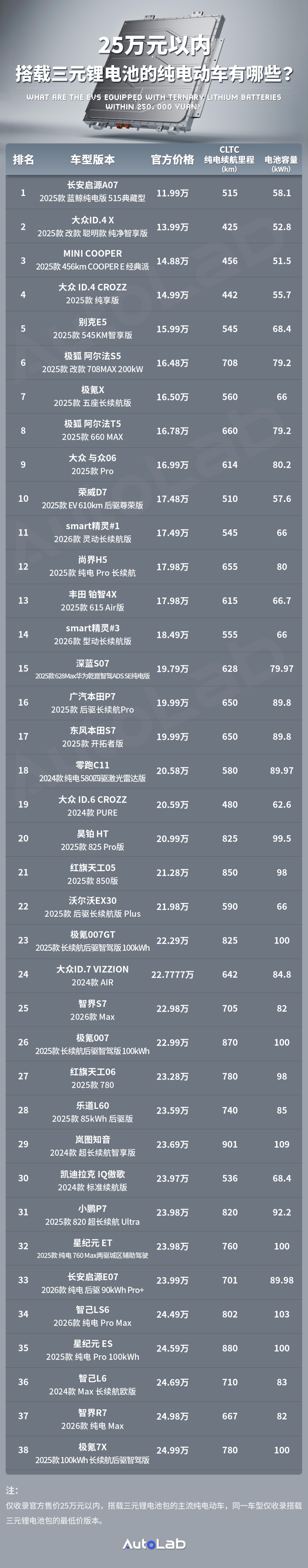 The use of ternary lithium and lithium iron phosphate for batteries once became the dividing line between high-end and low-end pure electric vehicles. But now with the development of battery technology, the performance of lithium iron phosphate has gradually caught up with ternary lithium. But there are still many car owners who hope to use better batteries at a cheaper price. So today, from the perspective of ternary lithium battery packs, we will provide you with a small car buying guide. What pure electric vehicles with ternary lithium batteries can you buy for less than 250000 yuan?